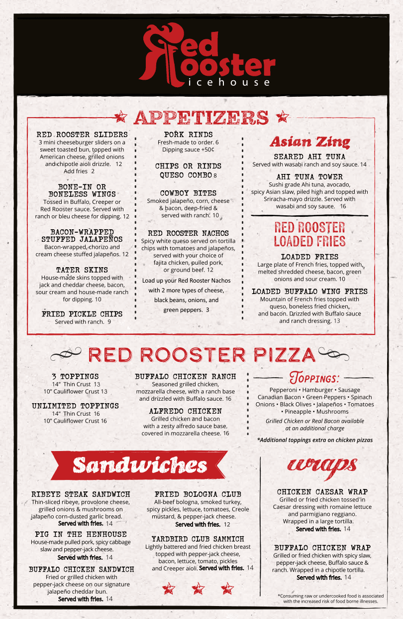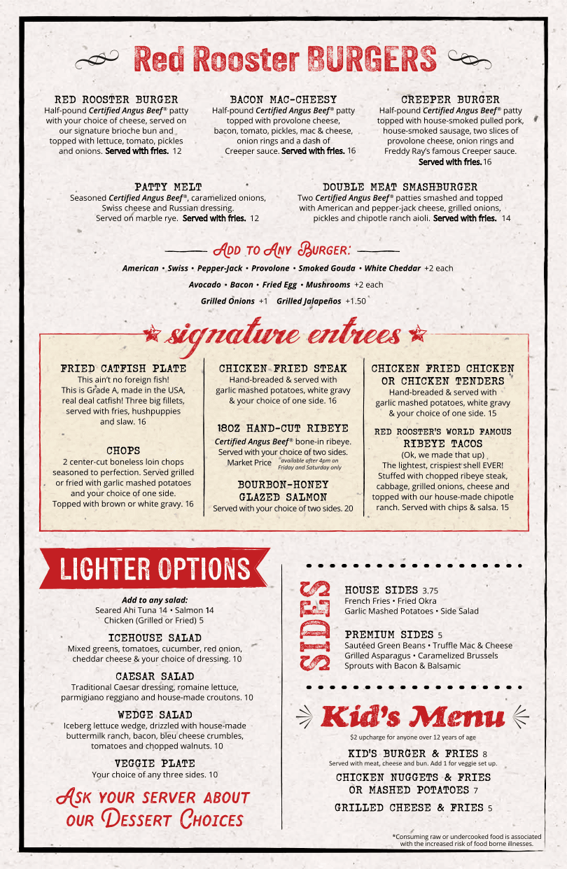 At Red Rooster IceHouse, we’re proud to serve up a variety of mouthwatering dishes made fresh for you. Whether you’re stopping by for lunch, dinner, or our famous Sunday brunch, you’ll find options the whole family will love. Dine with us at 1470 N Beaulah St, or order carryout to enjoy your favorites on the go.